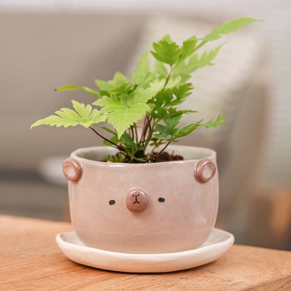 Thai Bear-Themed Glazed Ceramic Flower Pot and Saucer Set 'Bear Blossoming' Item ID: 2671796697