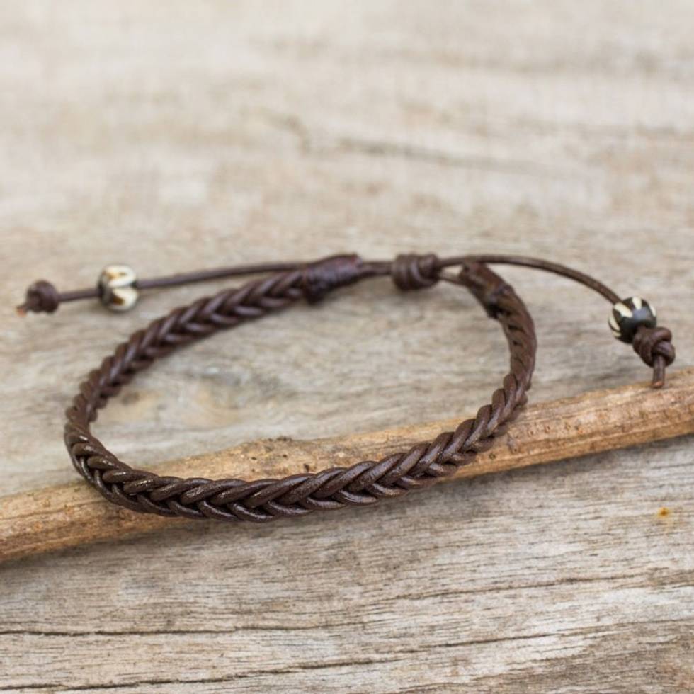 Thai Brown Leather Braided Men's Bracelet 'Single Brown Braid' Item ID: 2669929377