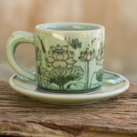 Thai Celadon Espresso Cup and Saucer Set 'Pink Lotus Butterflies' Item ID: 2676647473