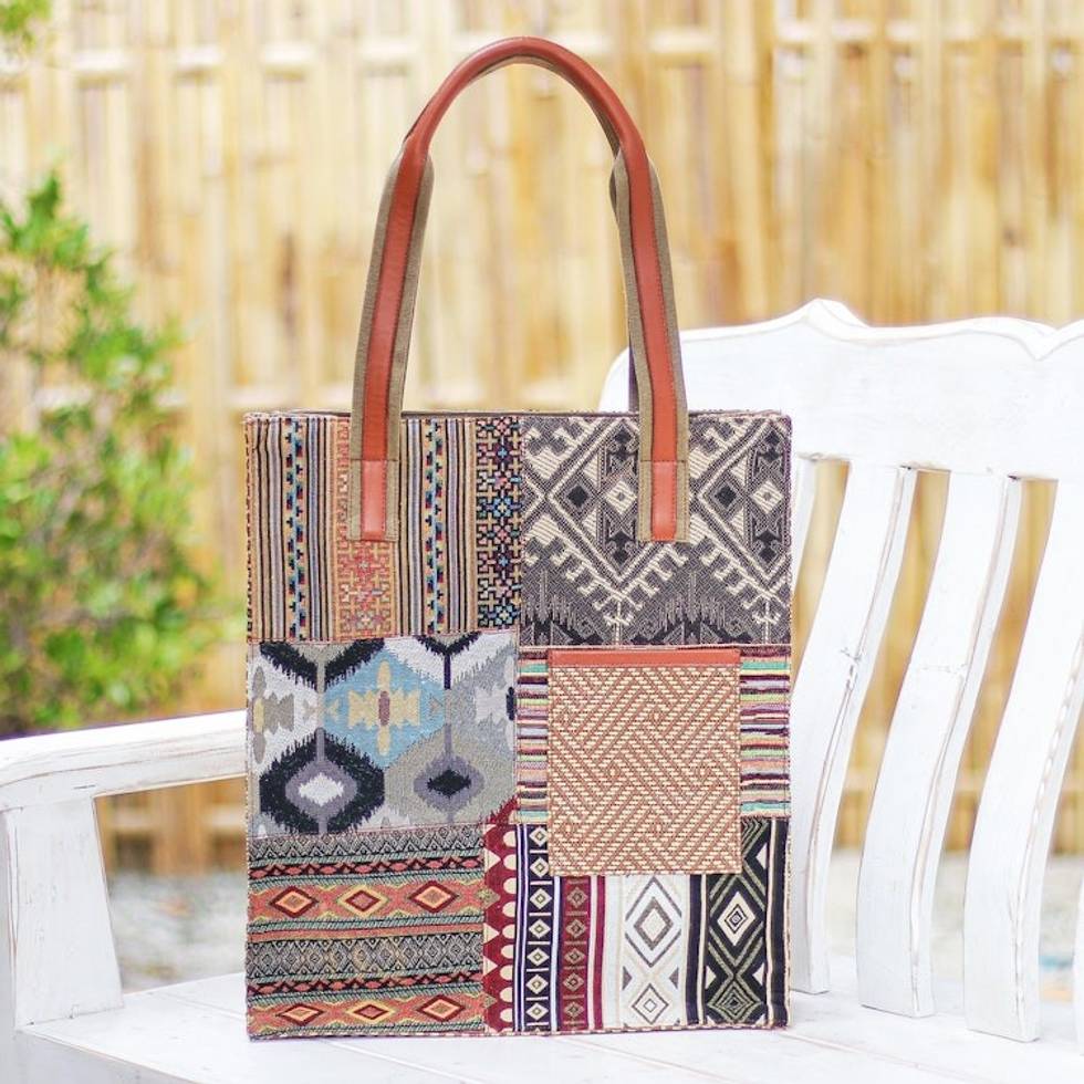 Thai Cotton Blend and Leather Tote Bag 'Happy Day in Yellow' Item ID: 2671800009