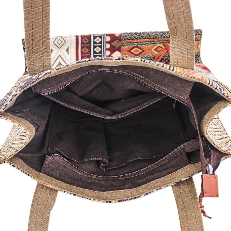 If you're looking for a great bag this is it! It's not only beautiful with the braided leather handles, trim and tassles but I love the fabric exterior! The pattern is really pretty especially for summer and there is so much room in this bag with the 3 large openings, and smaller pockets too, making a perfect bag for vacations and day trips! Comfortable to wear.