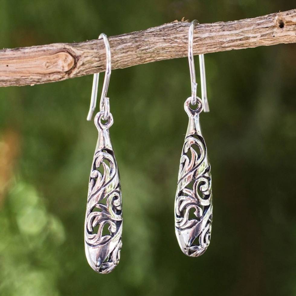 Thai Filigree Dangle Earrings in Polished Sterling Silver 'Filigree Dew' Item ID: 2669925850