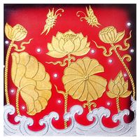 Thai Folk Art Acrylic and Foil Painting with Lotus Motif 'Lotus Garden' Item ID: 2669889085