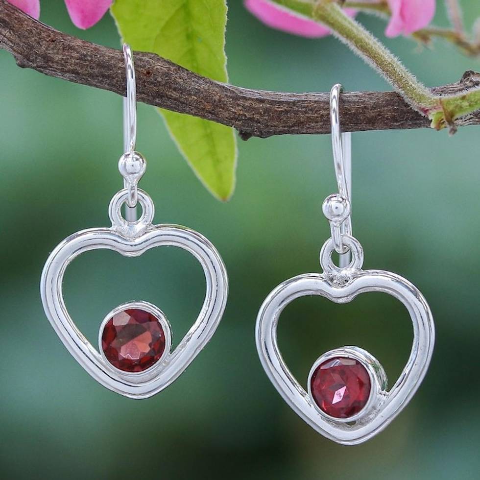 Thai Garnet Dangle Earrings with Heart Motif 'Earnest Offer in Red' Item ID: 2671799770