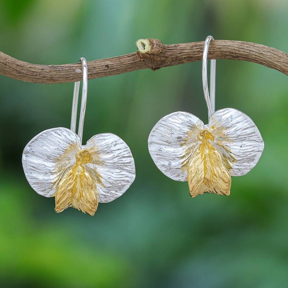 Thai Gold-Accented Floral Drop Earrings 'Golden Orchid' Item ID: 2671798023