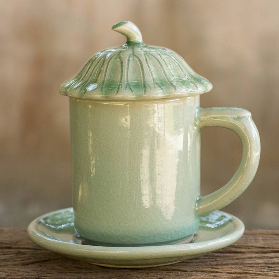 Thai Green Celadon Ceramic Covered Cup and Saucer 'Green Lotus Leaf' Item ID: 2671802081