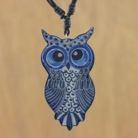 Thai Handmade Blue Ceramic Owl Adjustable Pendant Necklace 'Alluring Blue Owl' Item ID: 2671801118
