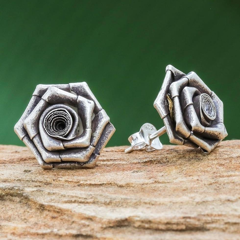 Thai Karen Hill Tribe Silver Flower Earrings 'Origami Rose' Item ID: 2671799035