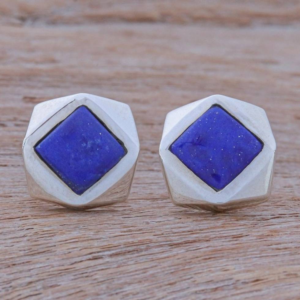 Thai Lapis Lazuli and Sterling Silver Button Earrings 'Winter Storm' Item ID: 2671641024