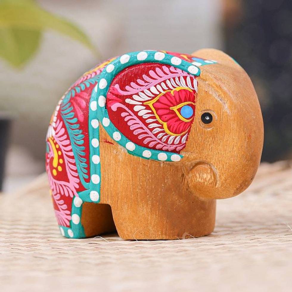 Thai-Made Floral Painted Raintree Wood Elephant Figurine 'Tiny Beloved' Item ID: 2676653709