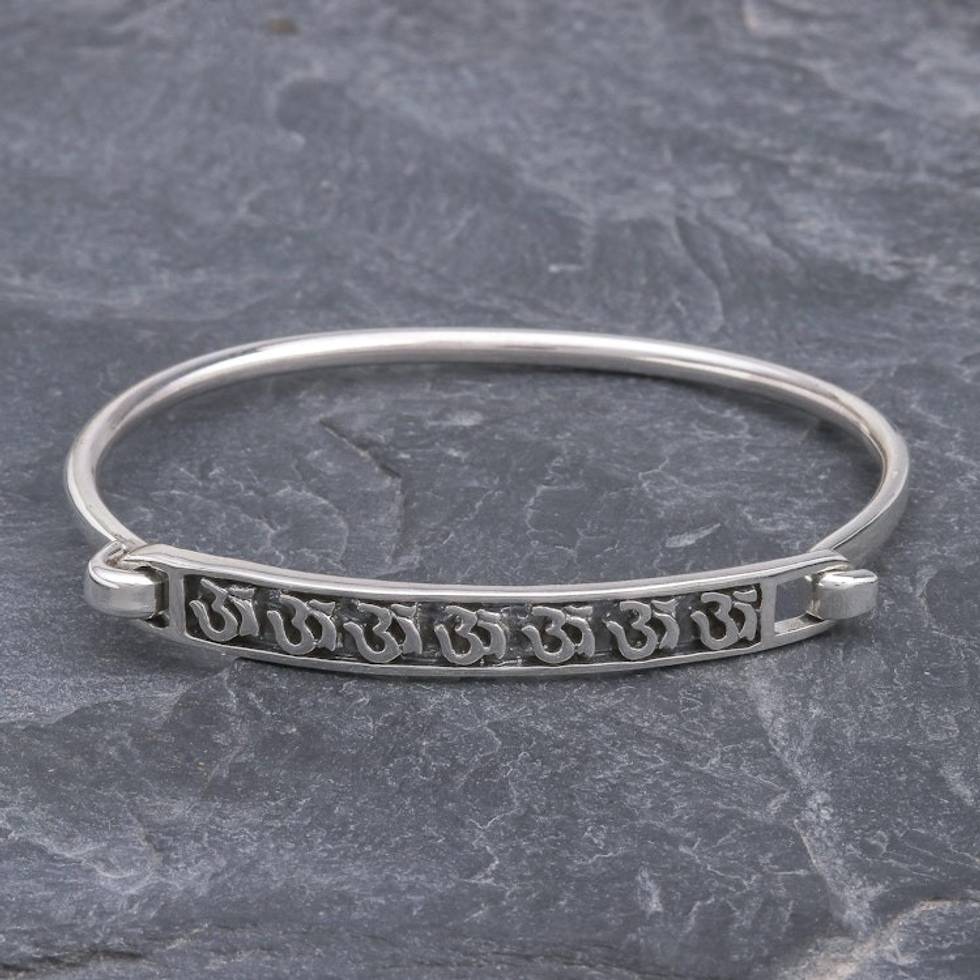 Thai Om Symbol Sterling Silver Bangle Bracelet 'Seven Mantras' Item ID: 2669925890
