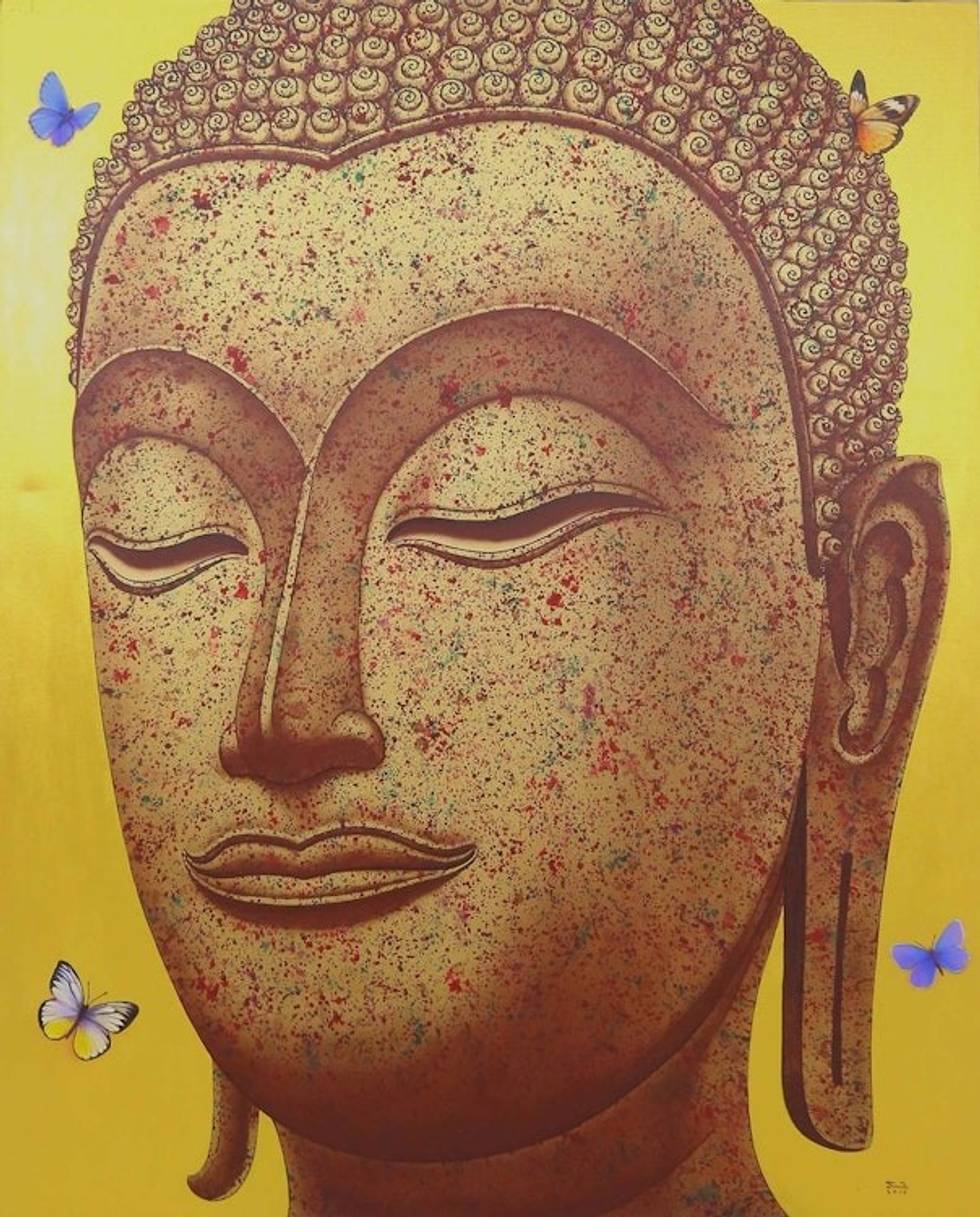 "Butterflies flutter around the serene image of Buddha facing left depicted in golden hues - the color of the sun. Tanachai Ekuruchaitep works with acrylics to honor the great spiritual teacher through his art. The Thai artist is inspired by the portrayal of Buddha during the Sukhothai period (1238 to 1583), which was influenced by Sri Lankan monks. The Buddha images of this era featured such distinguishing characteristics as a flame over the head which itself was covered with finely curled hair. The oval face has high curving eyebrows, a hooked nose, a downward gaze, and a gentle smiling expression."