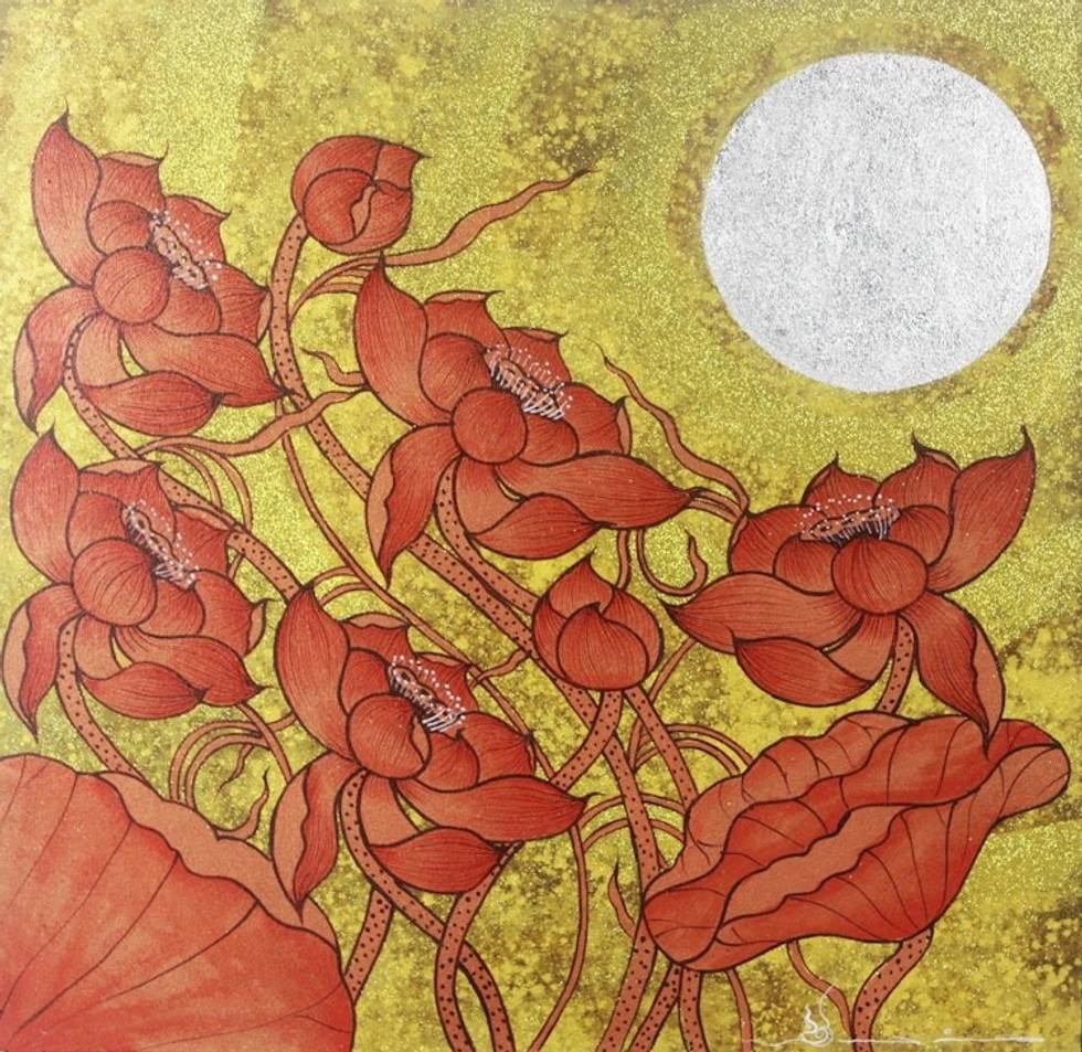 Thai Red Lotus Painting with Gold and Silver Foil 'Earthy Blossom II' Item ID: 2671802105