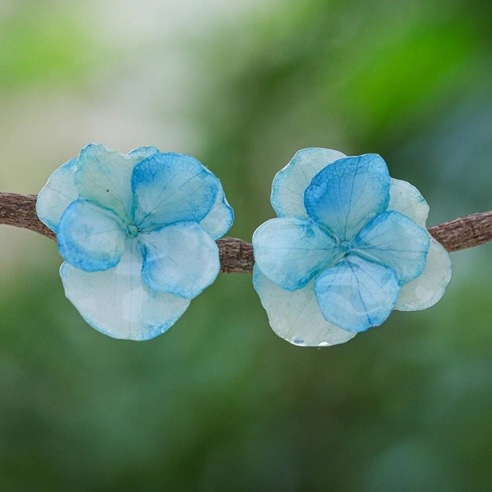 Thai Resin Coated Blue Hydrangea Bloom Post Earrings 'Azure Hydrangea' Item ID: 2671641321