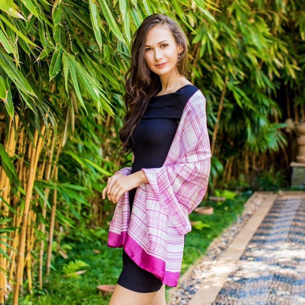 Thai White Silk Blend Shawl with Pink Batik 'Pink Plaid Batik' Item ID: 2671802340