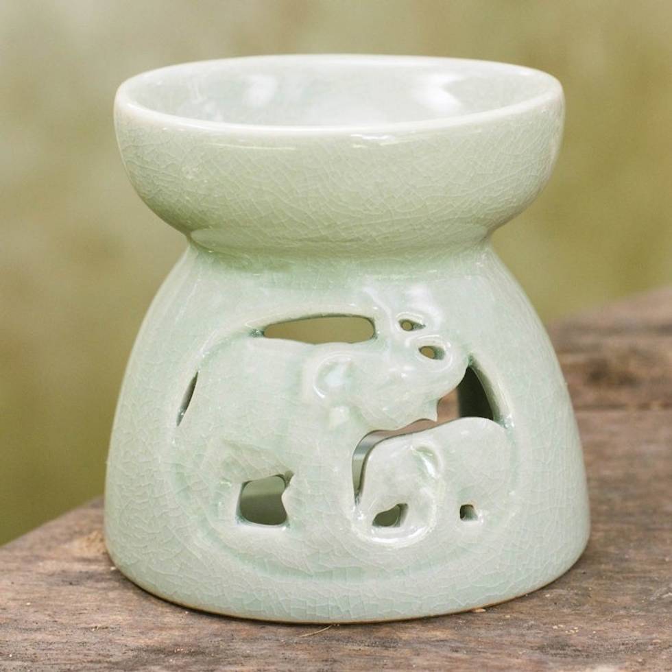 Thailand Elephants Handmade Green Ceramic Clay Oil Warmer 'Mother and Baby' Item ID: 2669897489