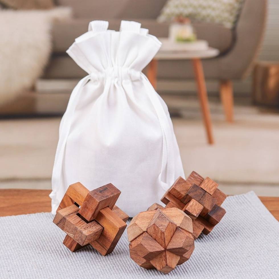 Three Thailand-Made Raintree Wood Puzzles with Storage Pouch 'Playful Moments' Item ID: 2671646593