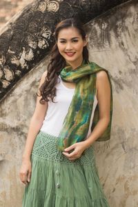 Tie Dye Green and Blue Silk Scarf from Thailand 'Green Thai River' Item ID: 2671802576