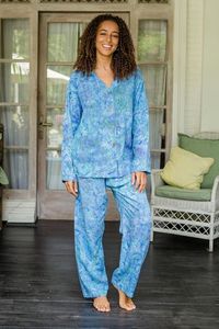 Tie-Dye Rayon Pajama Set from Bali 'Balinese Leaves' Item ID: 2671747590