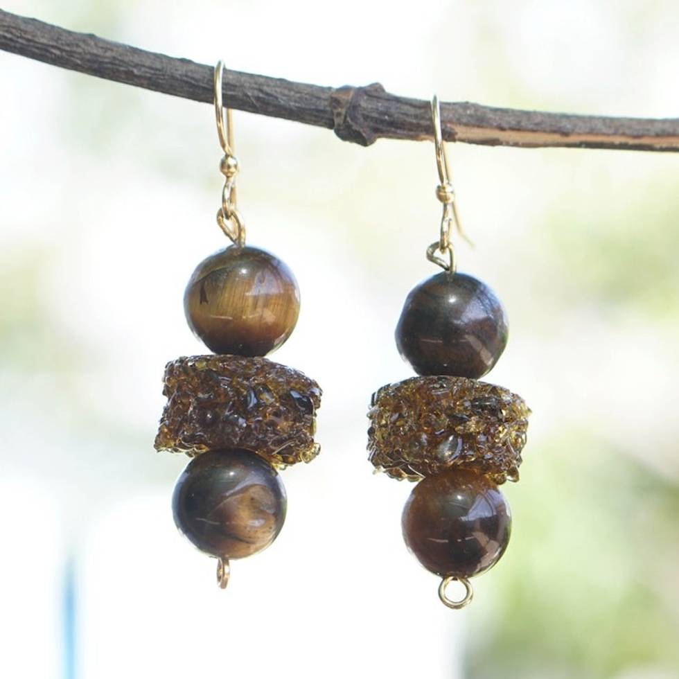 Tiger's Eye and Recycled Glass Beaded Dangle Earrings 'Ntoboase Ye' Item ID: 2671804454