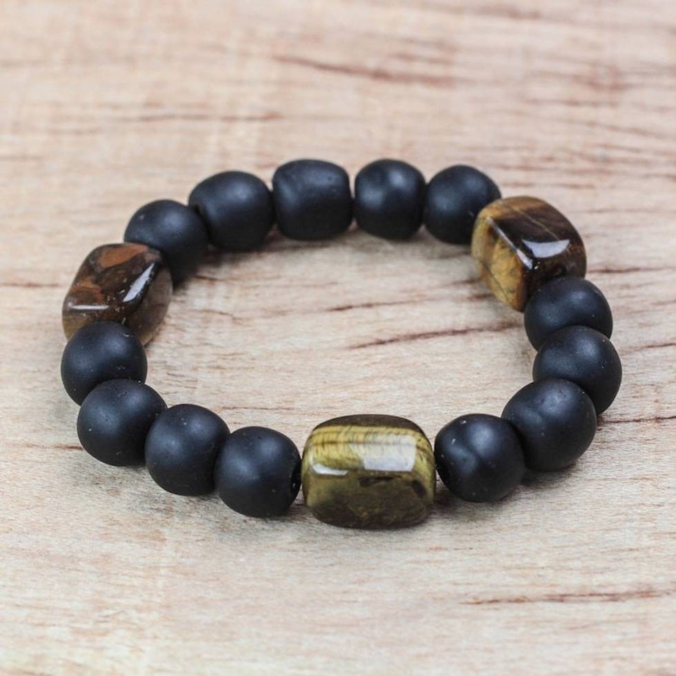 Tiger's Eye Matte Black Recycled Glass Bead Stretch Bracelet 'Substance' Item ID: 2671806477