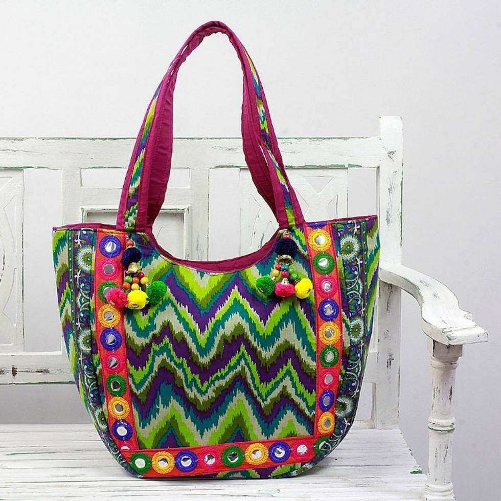 Tote Handbag with Green Zigzag Motifs from India 'Sonic Green' Item ID: 2671791828