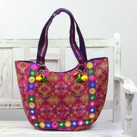 "A beautiful world of pink kaleidoscopic colors covers the surface of this tote handbag, printed by Indian artisan Om Prakash. Working with local artisans, he accentuates the handbag with circular rayon embroidery and silver-tone sequins, hanging woolen pompoms from the straps. The handbag opens with a zipper to reveal a cotton lining in blue-violet with a single inner zipper pocket."