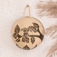 "Perching on a tree branch, two intertwined toucans are depicted in a tranquil moment of rest. The serene scene is hand-carved in dried calabash gourd by the artisans of Costa Rica's Guevara Cabalceta Family for an exquisite decorative accent you can display on your walls with the help of the accompanying agave cord."