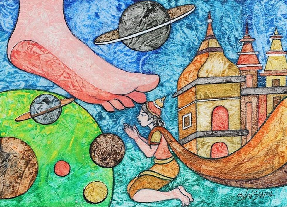 Traditional Acrylic on Canvas Painting of Vamana Avatar 'Sacred Step' Item ID: 2671781133