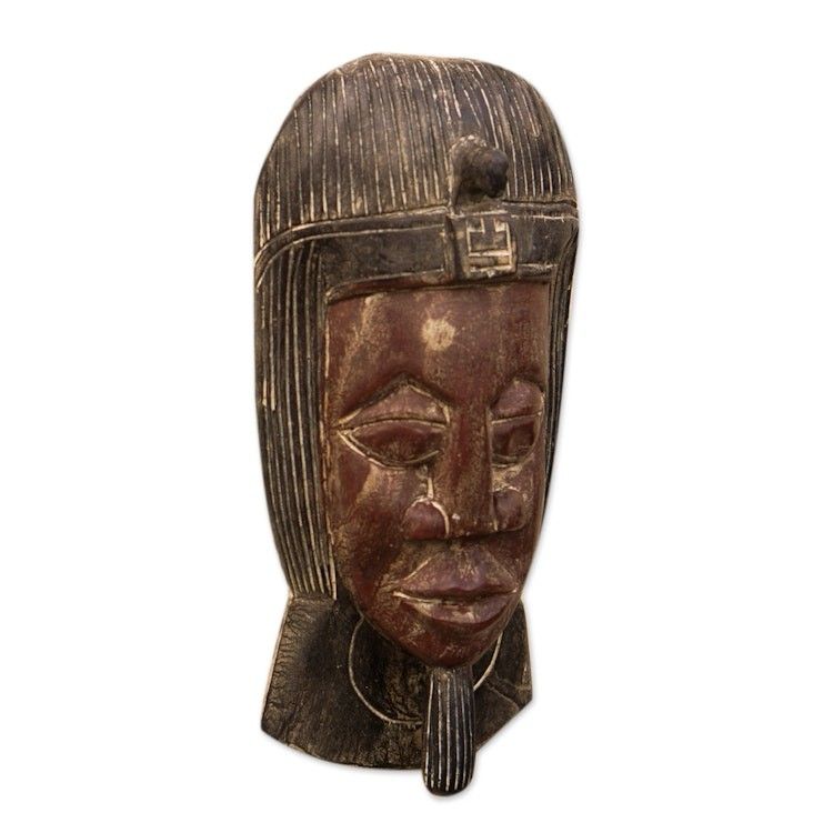 "The magnificence and beauty of the ancient Ghana are captured in this African ceramic-accented sese wood mask crafted by Frank Odei Amoani in honor of his heritage and country. After hours of hard work, the final result is a gorgeous piece of art in a traditional palette of brown and black hues, depicting the majestic image of an ancestral king."