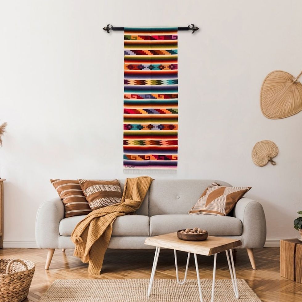 Zosimo utilizes alpaca, sheep wool, and cotton in the fabrication of his pieces, while both natural and synthetic dyes create the enthralling blend of colors. The treadle loom is his primary tool.