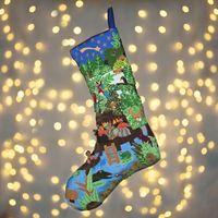 Purchased this stocking for my daughter, a children’s librarian and was so excited to see the details sewn into the stocking. People and creatures of the jungle cover this wonderfully colored stocking. Excellent craftsmanship went into this creation.