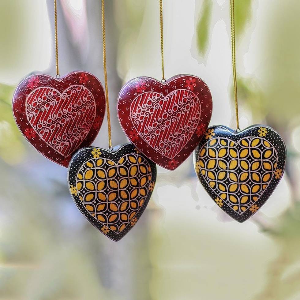 Traditional Batik Wood Heart Ornaments from Java Set of 4 'Traditional Hearts' Item ID: 2671821241