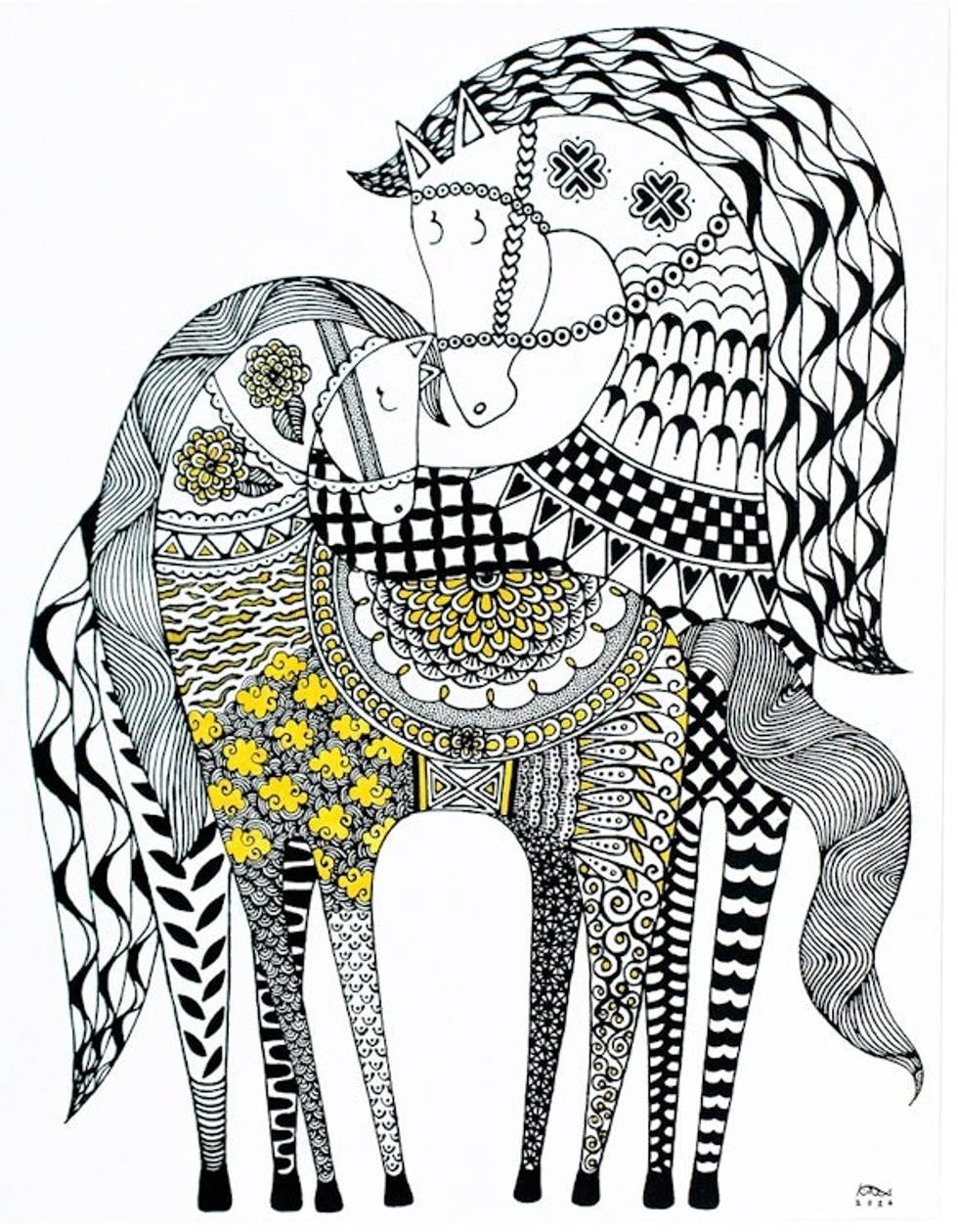 "Heroic and noble, these horses leave their usual gallant aura to create a tender family scene that invites you to reflect on your connection with loved ones. Thai artist Surangrat uses acrylic on canvas and a traditional style to paint this impressionist composition, whose combination of black and yellow hues exudes majesty.