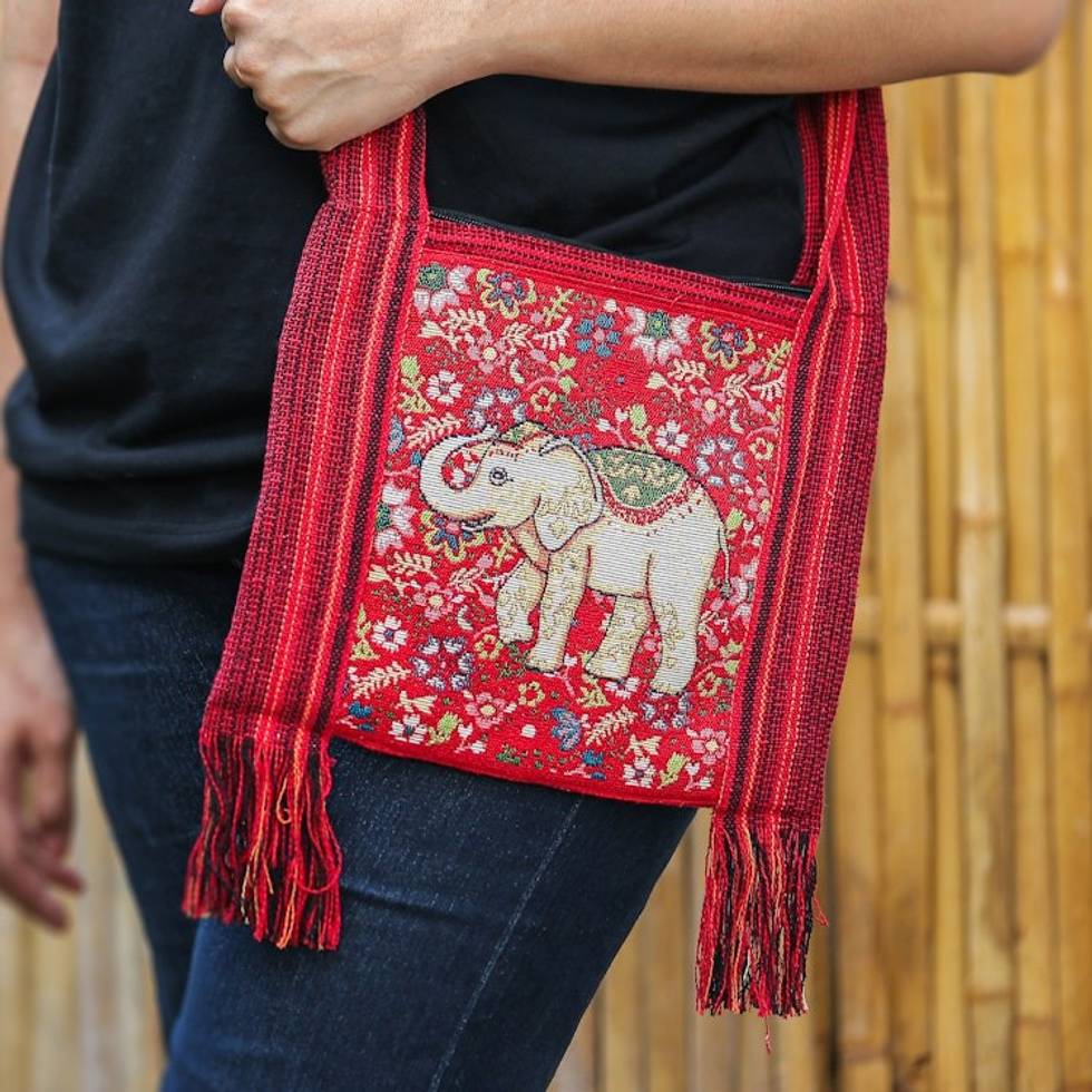 Traditional Elephant-Themed Floral Red Sling with Fringes ''Elephant's Delight' Item ID: 2669892540