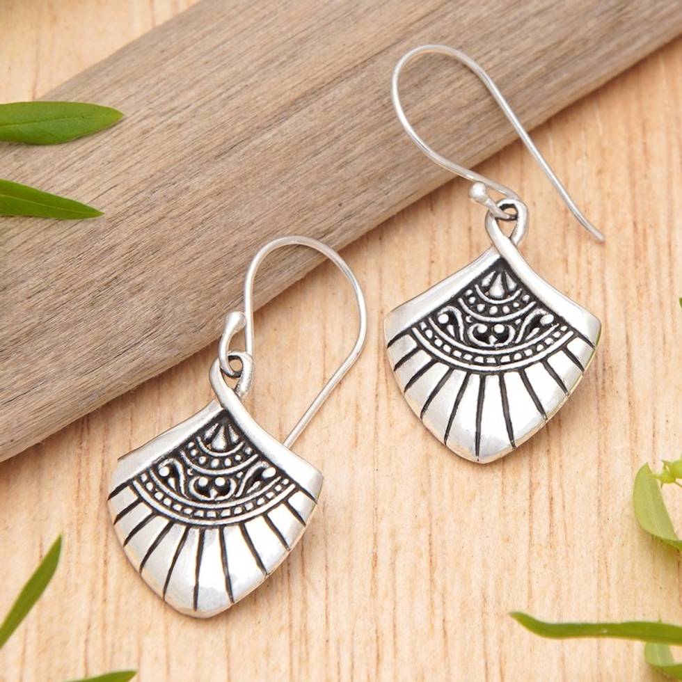 Traditional Fan-Shaped Sterling Silver Dangle Earrings 'Gianyar Morning' Item ID: 2671765768