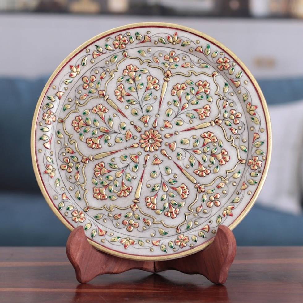 Traditional Floral and Leafy Marble Decorative Plate 'Blooming Celebration' Item ID: 2671781877