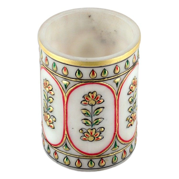 "Reminiscent of a glorious palace embellished with floral details, Anil Bhardwaj's newest design arrives from distant Indian lands to infuse your office or working space with majestic grace. Crafted from marble, this pen holder displays hand-painted motifs in a palette of golden, red and green hues, typical of the region's artistry."