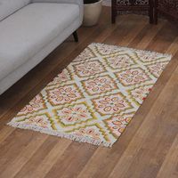 "Inspired by India's glamorous palaces, a splendid design comes to transform your spaces. Master artisan Ashfaq Ahmed works days on a traditional handloom to create this wool area rug, combining red, green and orange hues on an alabaster base color, allowing for a charming floral pattern. In addition, fringes decorate each end."