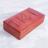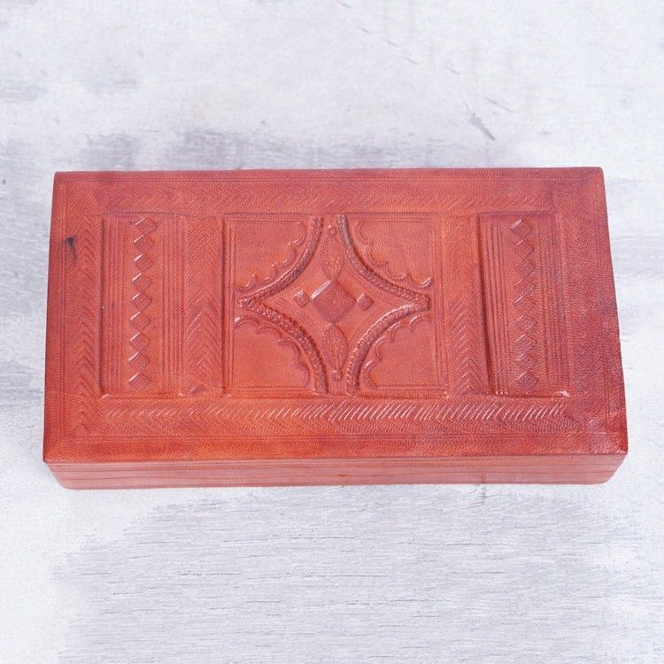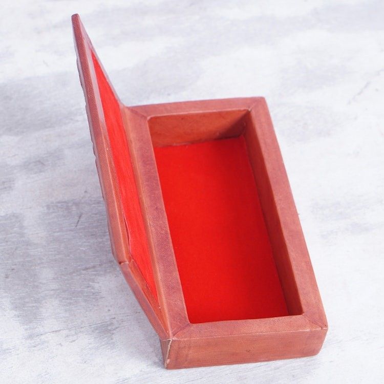 "Artisan Mohammed Sckeek of Ghana creates the perfect home for your jewelry treasures. Sese wood and leather compose this jewelry box, decorated with regal details. Lined with velvet, the piece has a generous space and a lustrous palette of brown hues."