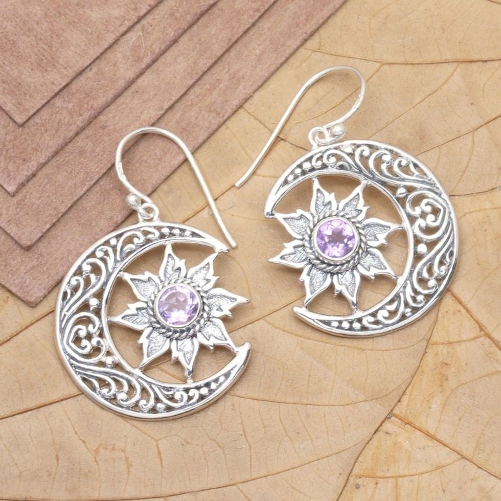 Traditional Moon and Floral-Themed Amethyst Dangle Earrings 'Purple Cycle' Item ID: 2671765487