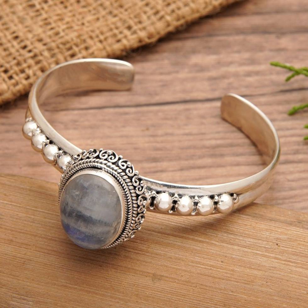 Traditional Natural Rainbow Moonstone Cuff Bracelet 'Queen Moonlight' Item ID: 2671764180