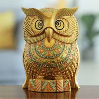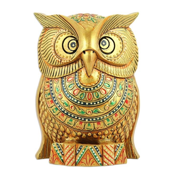 Traditional Painted Kadam Wood Magnet of a Golden Owl 'Golden Sage' Item ID: 2671786728