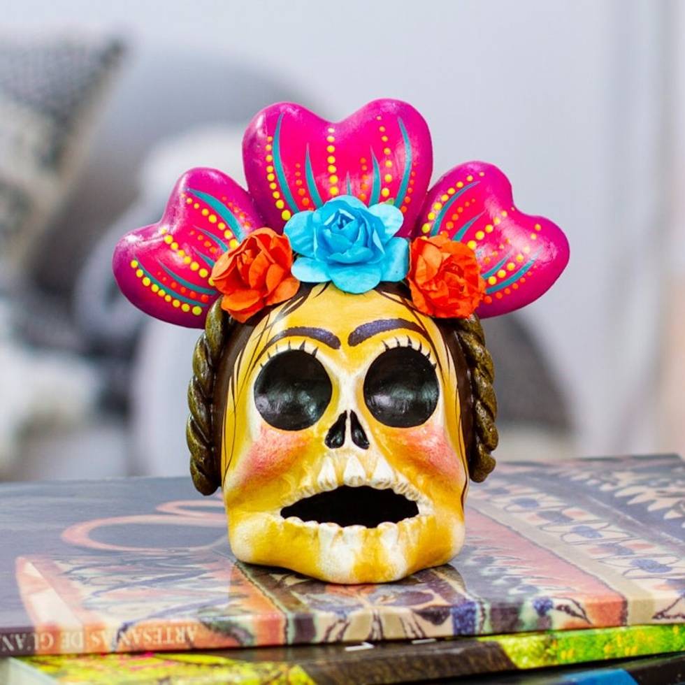 Brightly painted details and a wonderful 3D day of the dead skull on the lid of this box.