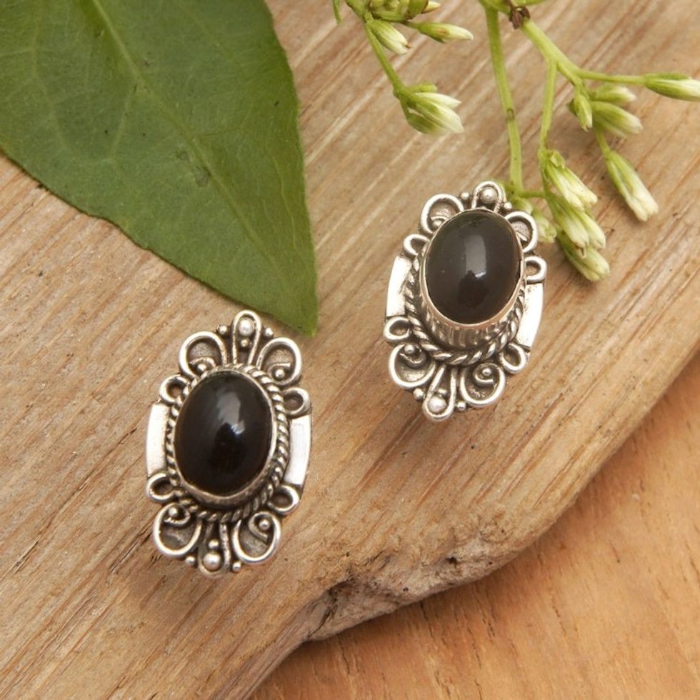 Traditional Sterling Silver Onyx Button Earrings from Bali 'Supreme Night' Item ID: 2671764506