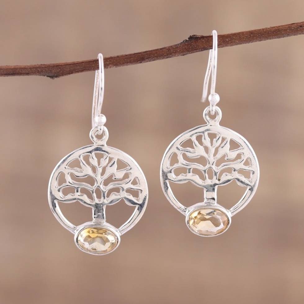 Tree-Shaped Citrine and Silver Dangle Earrings from India 'Corona Trees' Item ID: 2671790593
