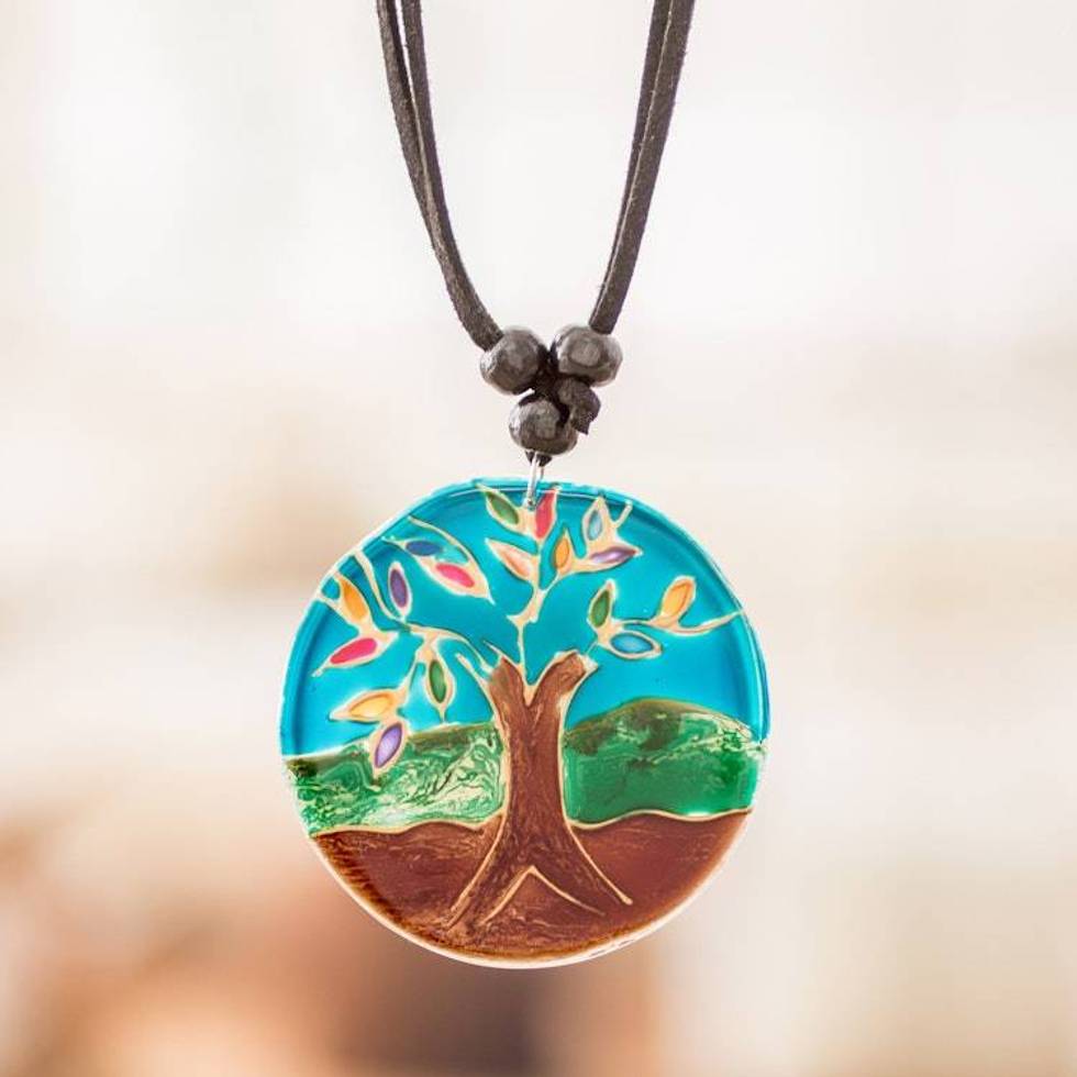 Tree-Themed Glass Pendant Necklace in Blue from Costa Rica 'Tree of Life at Night' Item ID: 2676659429