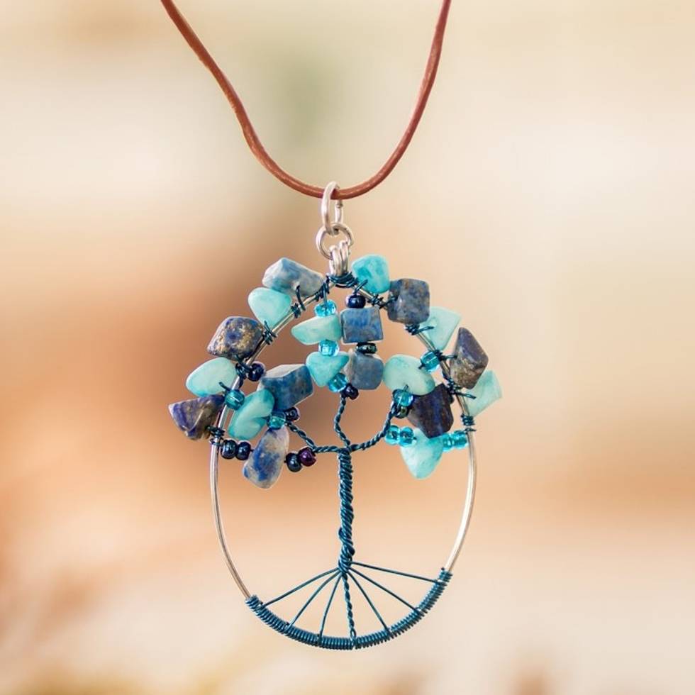 Tree-Themed Oval Blue Jasper and Quartz Pendant Necklace 'Forest in Blue' Item ID: 2671768989