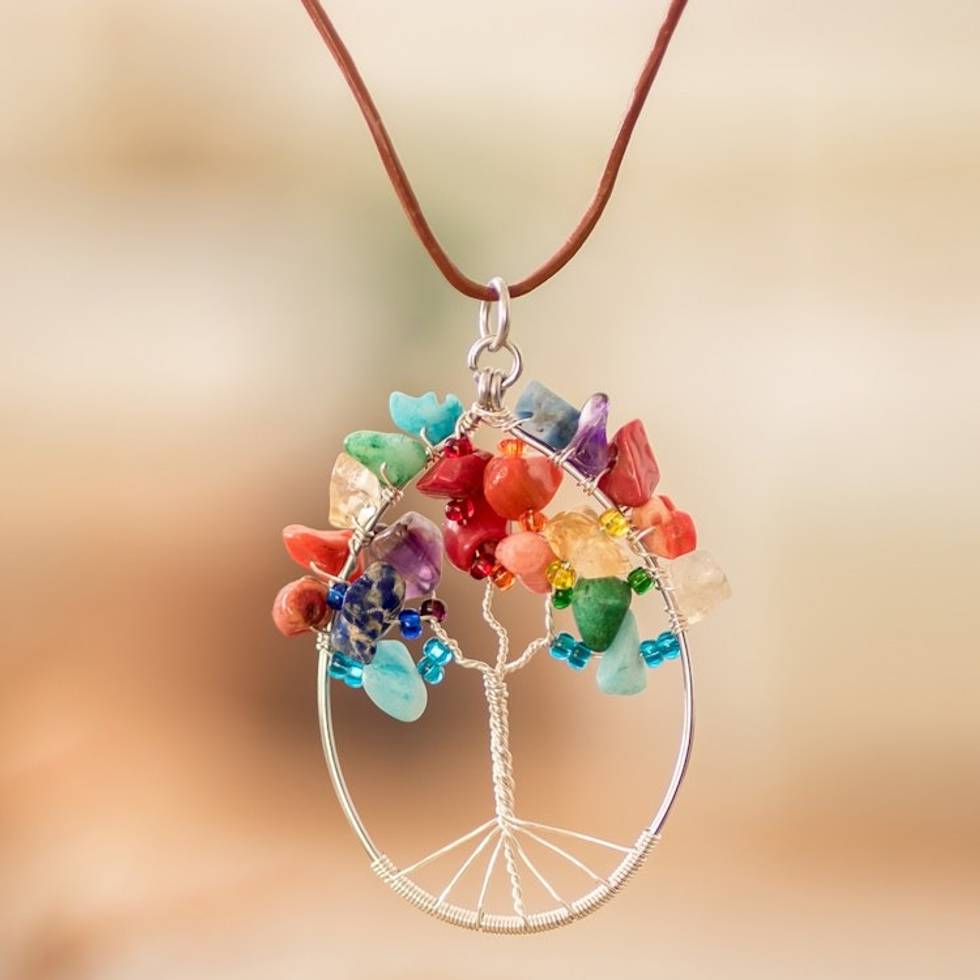 Tree-Themed Oval Multi-Gemstone Pendant Necklace 'Forest in Rainbow' Item ID: 2671769084