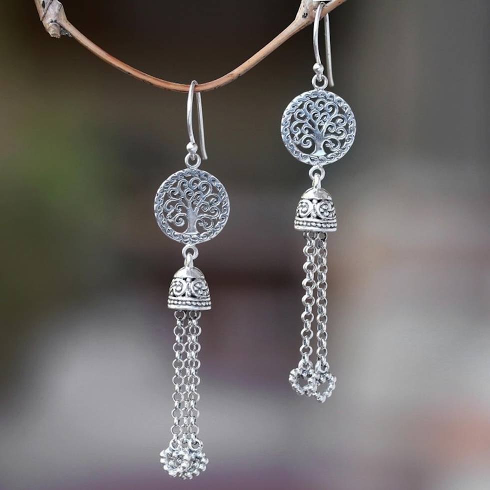 Tree-Themed Sterling Silver Waterfall Earrings from Bali 'Tree Bells' Item ID: 2671737705